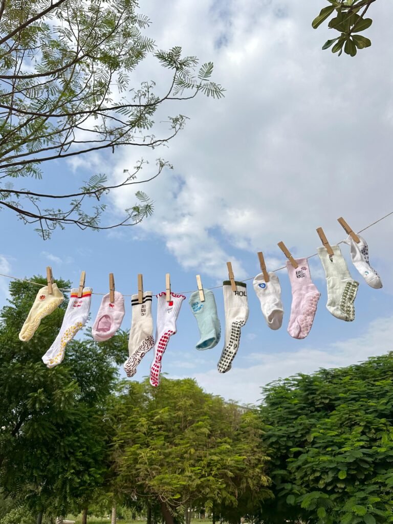Aya and Mira’s journey began with a shared frustration. As designers and Pilates enthusiasts, they noticed that grip socks were overwhelmingly plain and lacked personality. Determined to change this, they set out to create socks that could be both functional and stylish. Their goal was to let people express themselves while moving, whether in Pilates, Lagree, or barre classes.